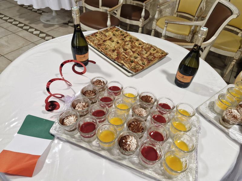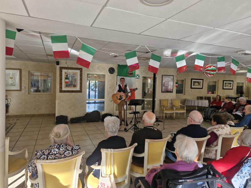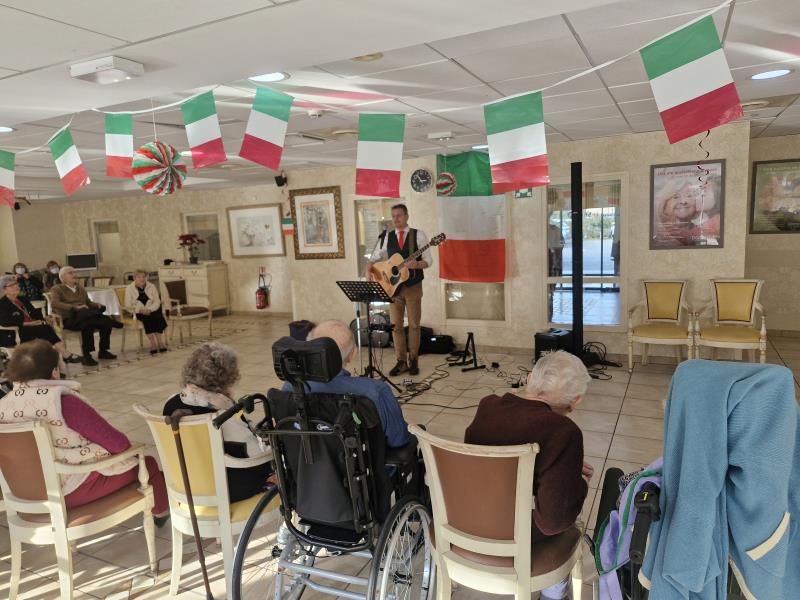 L'Italie était à l'honneur pour ce premier thème à la maison de retraite Les Jardins Médicis de Provins. Bien installés dans la salle à manger de la résience, Christophe nous a transporté avec ses chansons italiennes et Stéphane, notre chef cuisinier, nous a proposé pizzas, tiramisu et panaccota pour terminer ce voyage accompagné de Prosseco, ce fameux vin typiquement italien..
